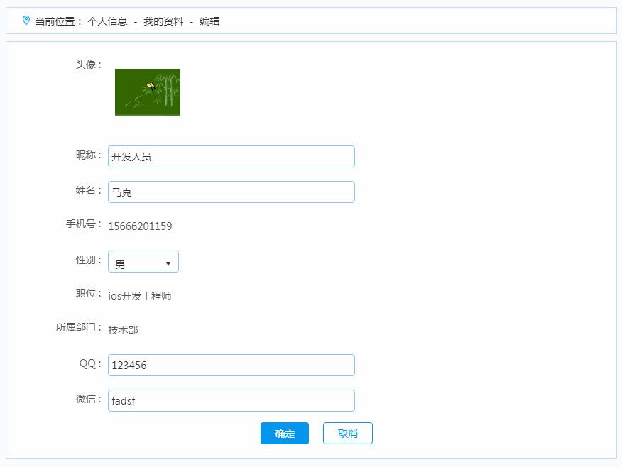 个人信息主要针对用户登录OA系统后在右上角个人信息中填写的个人资料信息。用户登录系统后点击右上角个人信息->编辑 ,在这里设置自己相关信息,如性别,工作电话,E-mail等详细信息。如图: