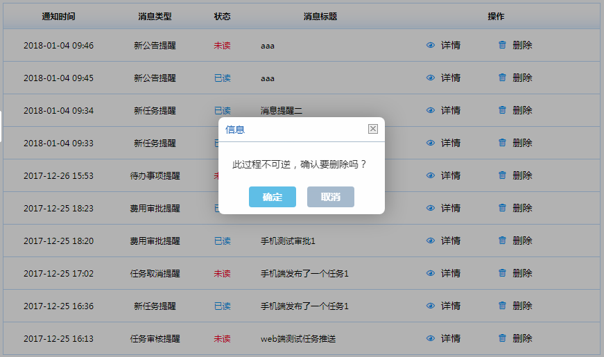 登录网页版OA系统进入首页-通知,选中要删除的信息右侧的删除按钮,点击出现提示,点击"确定"即可删除。如图: