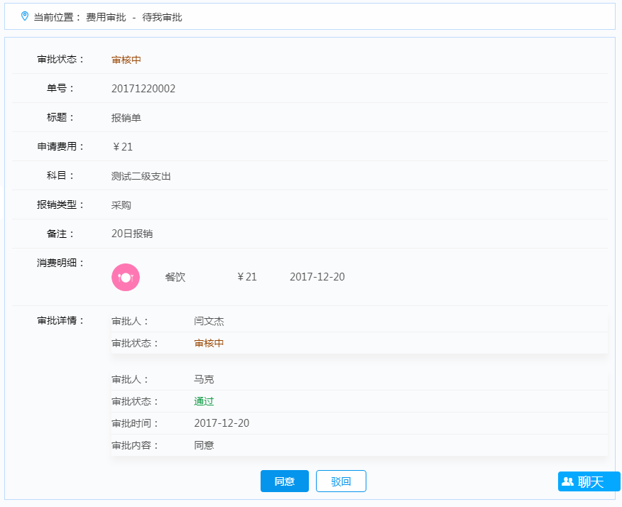 您好,进入费用审批-待我审批中可查看未处理的申请,点击可查看详情,在下方可看到通过和驳回的按钮进行操作。如图: